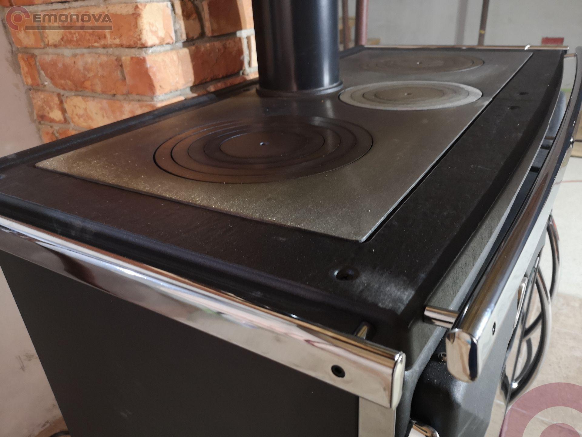 - višina kurišča je nastavljiva! Na dnu je litoželezna plošča, ki nosi polena in goreče oglje, katero se jo laho dvigne in približa kuhalni plošči. S tem se poveča toplota na kuhalni plošči.