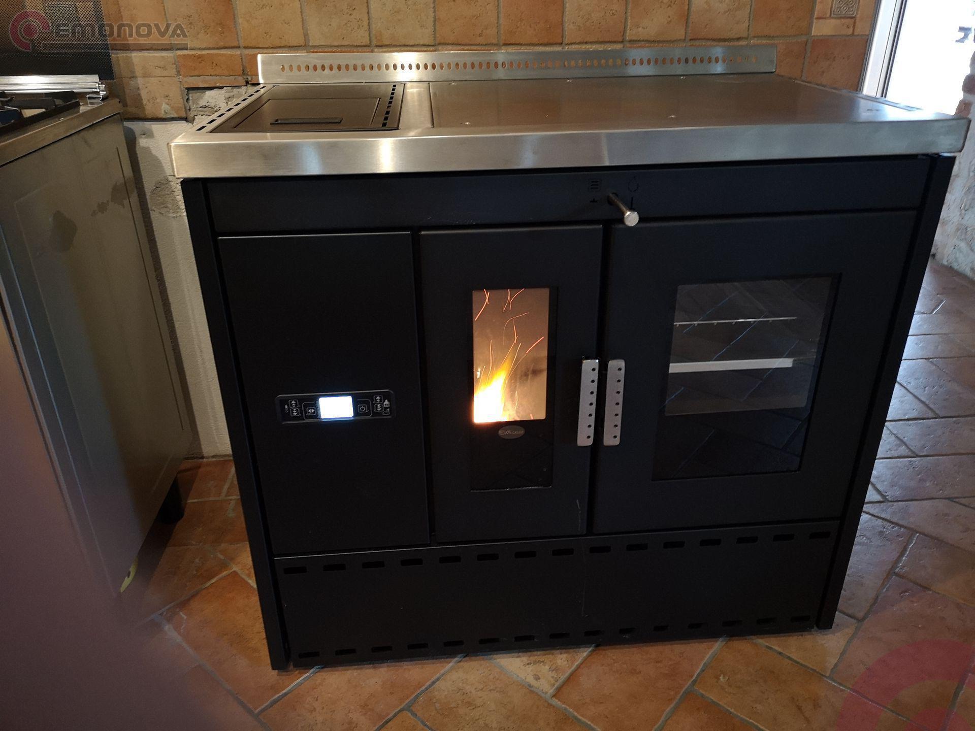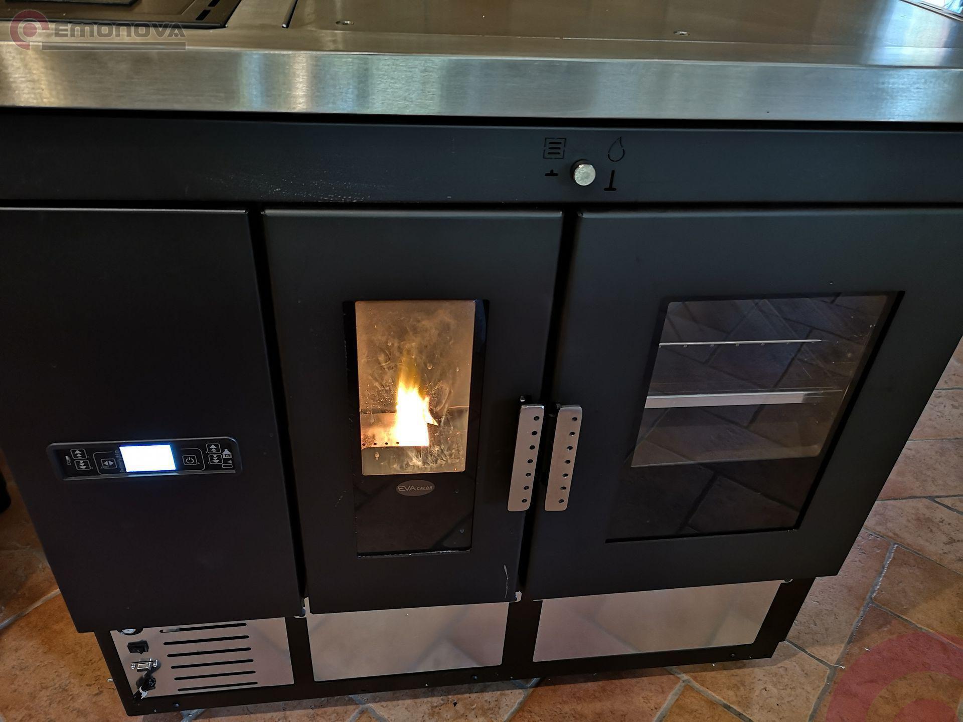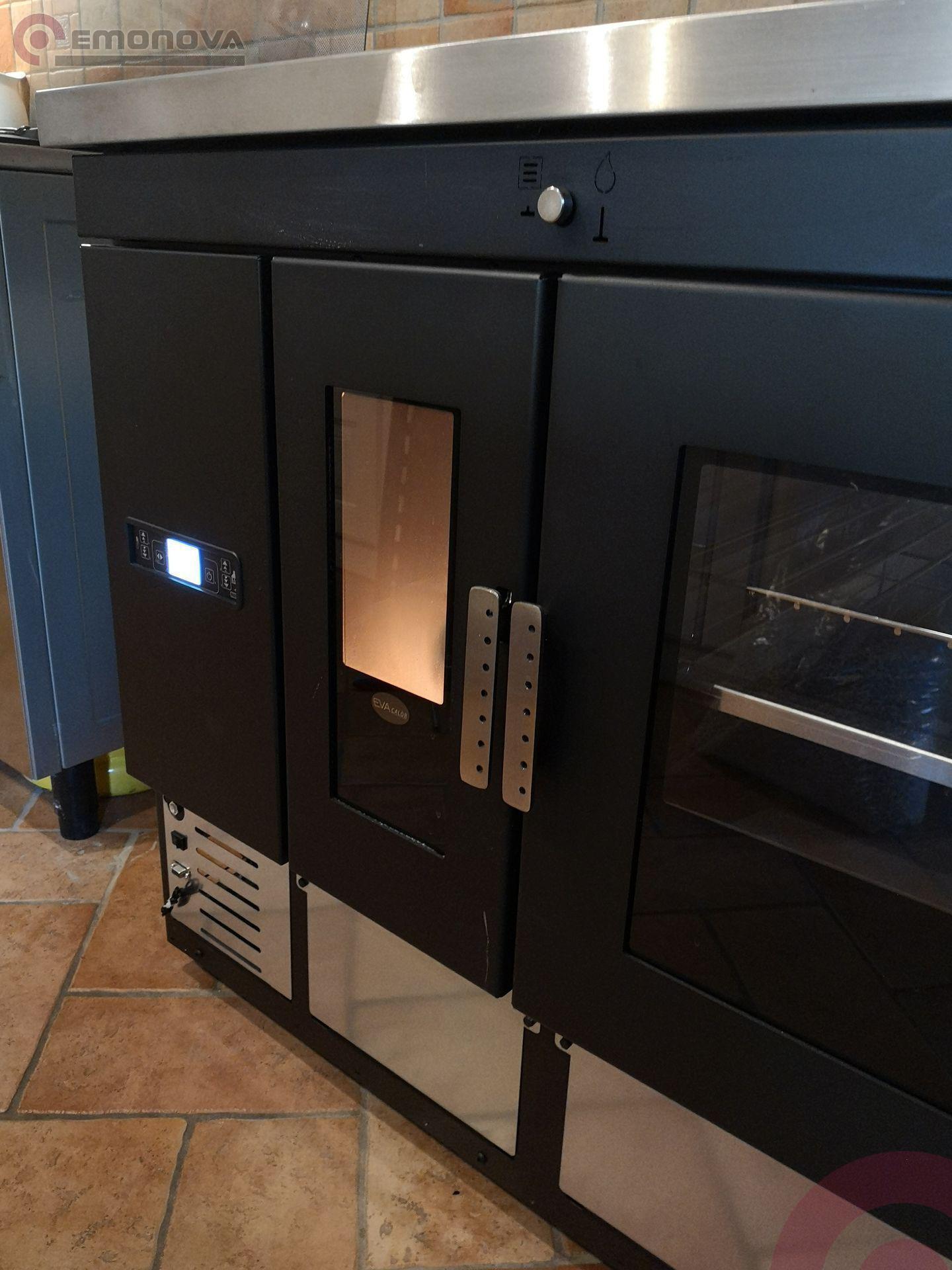 Etažni štedilnik na pelete Eva Calor Isotta je opremljena s pečico iz nerjavnega jekla z odstranljivimi rešetkami, aluminijastim pekačem in rešetko za peko, termometrom za pečica.