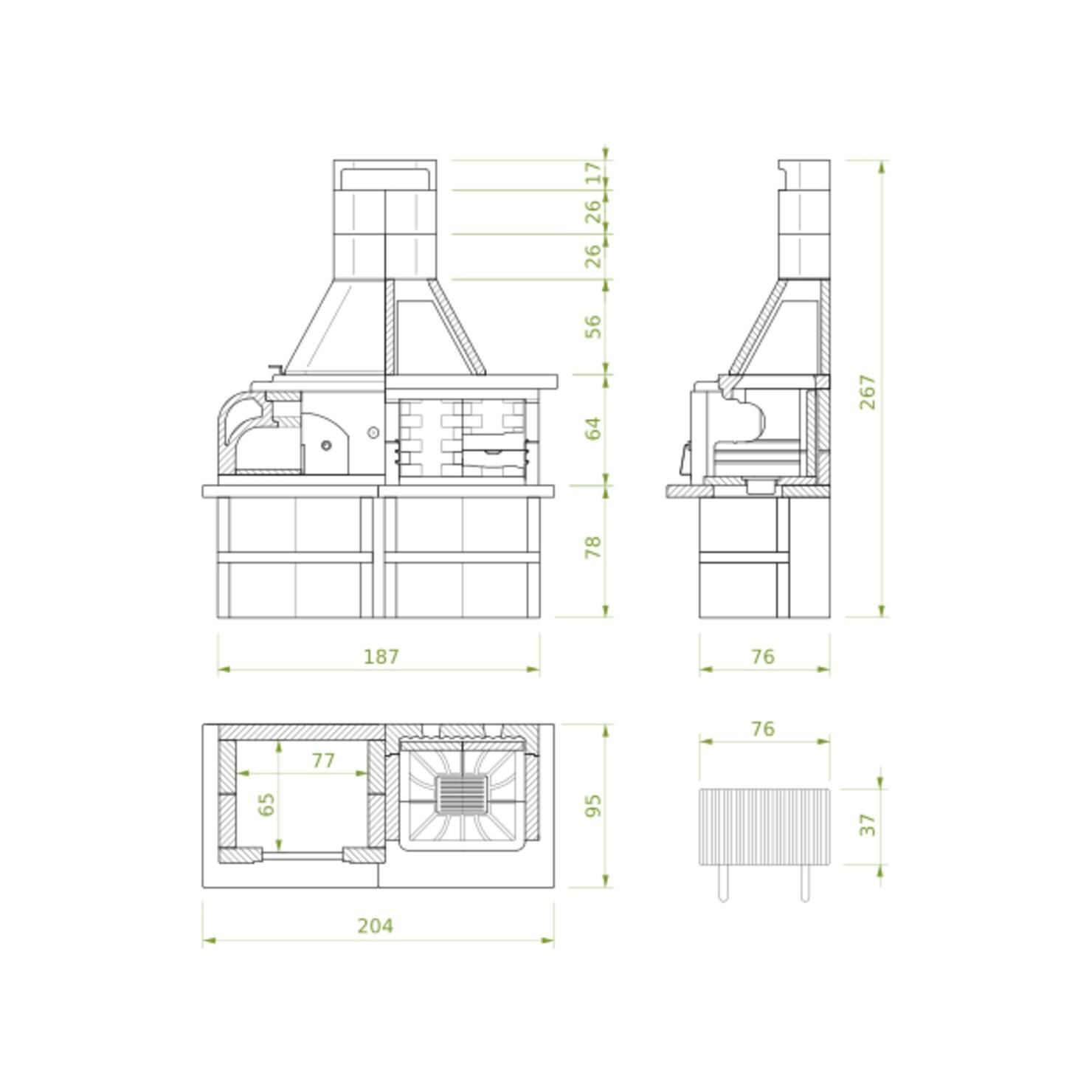 Ta vrtna kuhinja nima le velikega prostora za žar, kjer lahko pripravite okusne jedi z žara, kot so klobase, zrezki in zelenjavna nabodala, ampak vključuje tudi vgrajeno pečico. S to pečico lahko izkusite radosti peke na prostem, saj lahko s toploto ognja pripravite pico, kruh ali pecivo. Krušna peč na drva je izdelana iz ognjevzdržnega materiala in je opremljena z vratci kurišča iz lakiranega jekla. V vrata je vgrajen tudi termometer, s katerim lahko enostavno spremljate temperaturo v notranjosti, ne da bi vam bilo treba odpreti vrata pečice, kar zagotavlja popoln nadzor nad pečenjem.