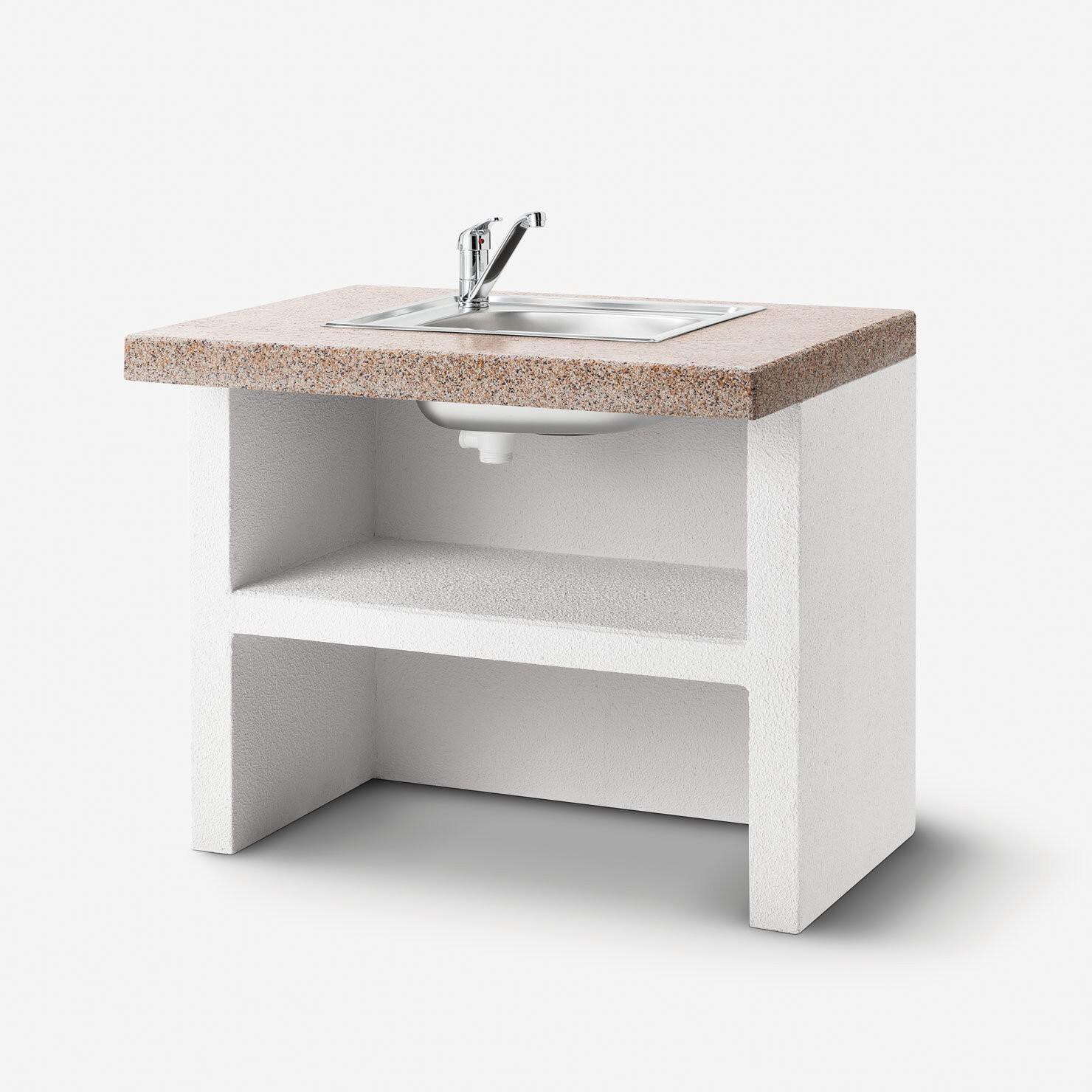 Element je opremljen s pomivalnim koritom iz nerjavečega jekla in vgrajeno mešalno pipo ter ima podstavek z zadnjo ploščo in praktično polico.