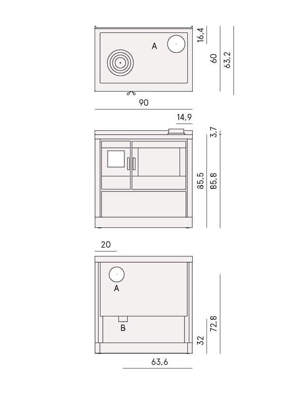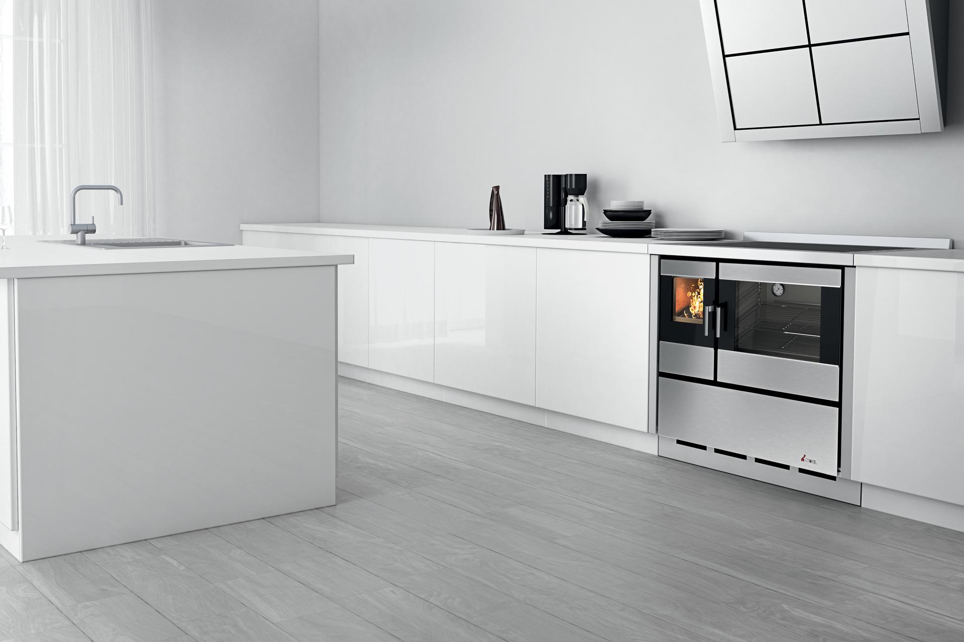 Ta vgradni štedilnik na drva odlikujejo prostor, namenjen pečici, široko steklo, skozi katerega lahko vidite, kako poteka peka, in široko kurišče, da imate vse pod nadzorom. Velika pečica iz nerjavnega jekla zagotavlja enakomerno peko hrane, aparat pa je enostaven za čiščenje, medtem ko je kuhalna plošča, ki je serijsko izdelana iz litega železa, na voljo tudi v steklokeramični različici.