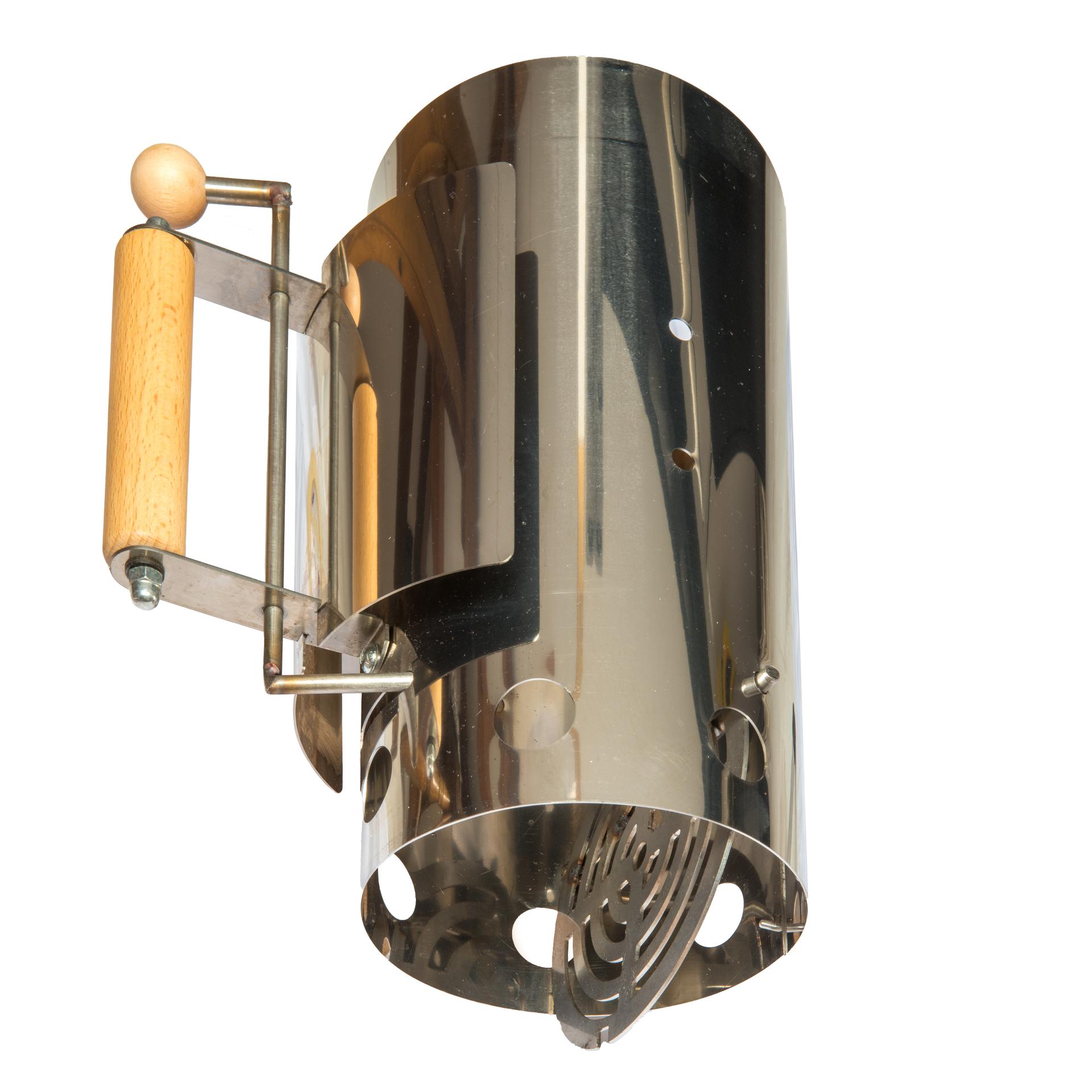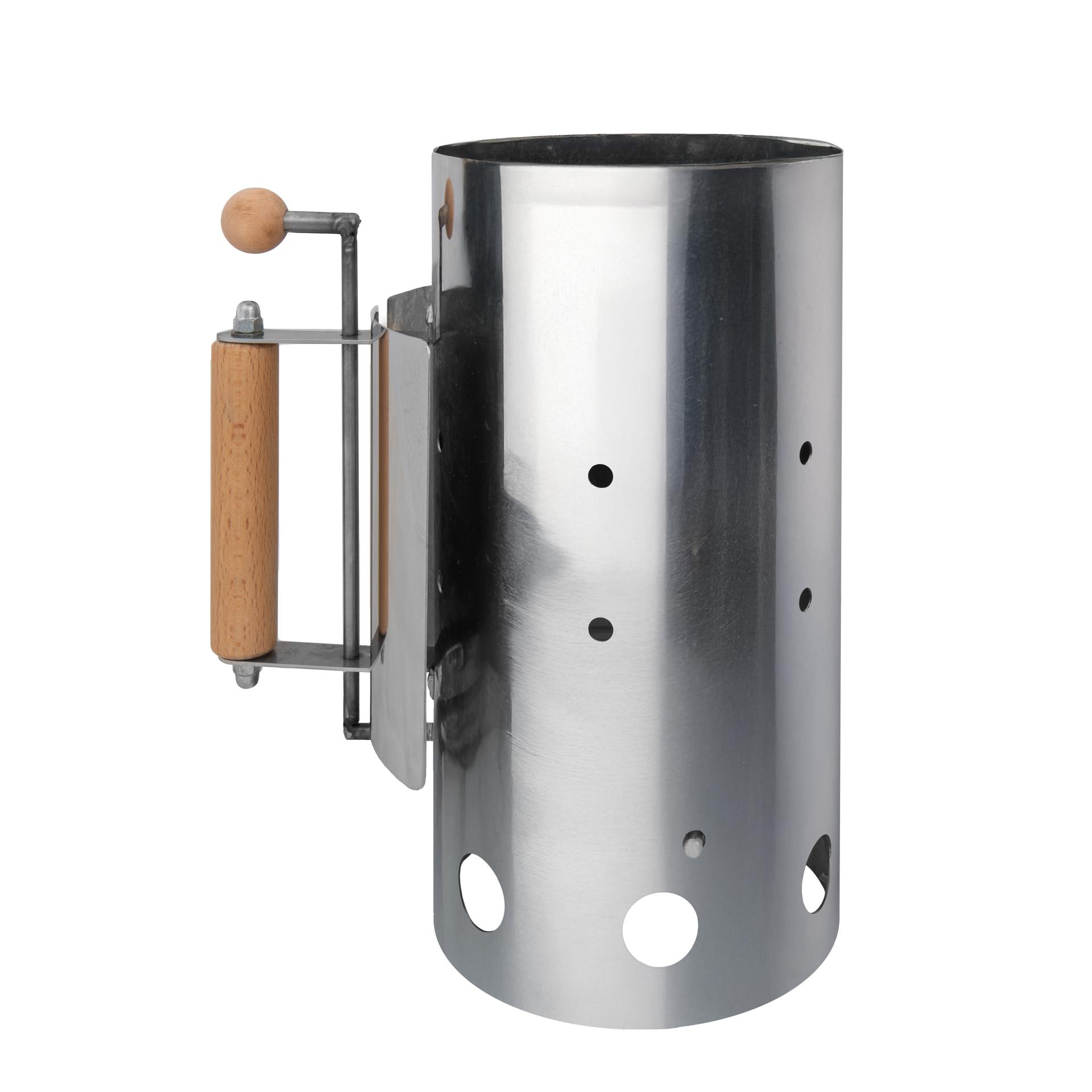 Njegova dimniška oblika in strateško nameščene prezračevalne odprtine zagotavljajo enakomerno gorenje, priročen mehanizem za odpiranje dna pa omogoča varno prenašanje vročega oglja v žar. Ergonomski ročaj s toplotno zaščito zagotavlja trden in varen oprijem. Priporočamo, da vedno nosite rokavice in dimnik po uporabi postavite na stabilno površino, da se ohladi.
