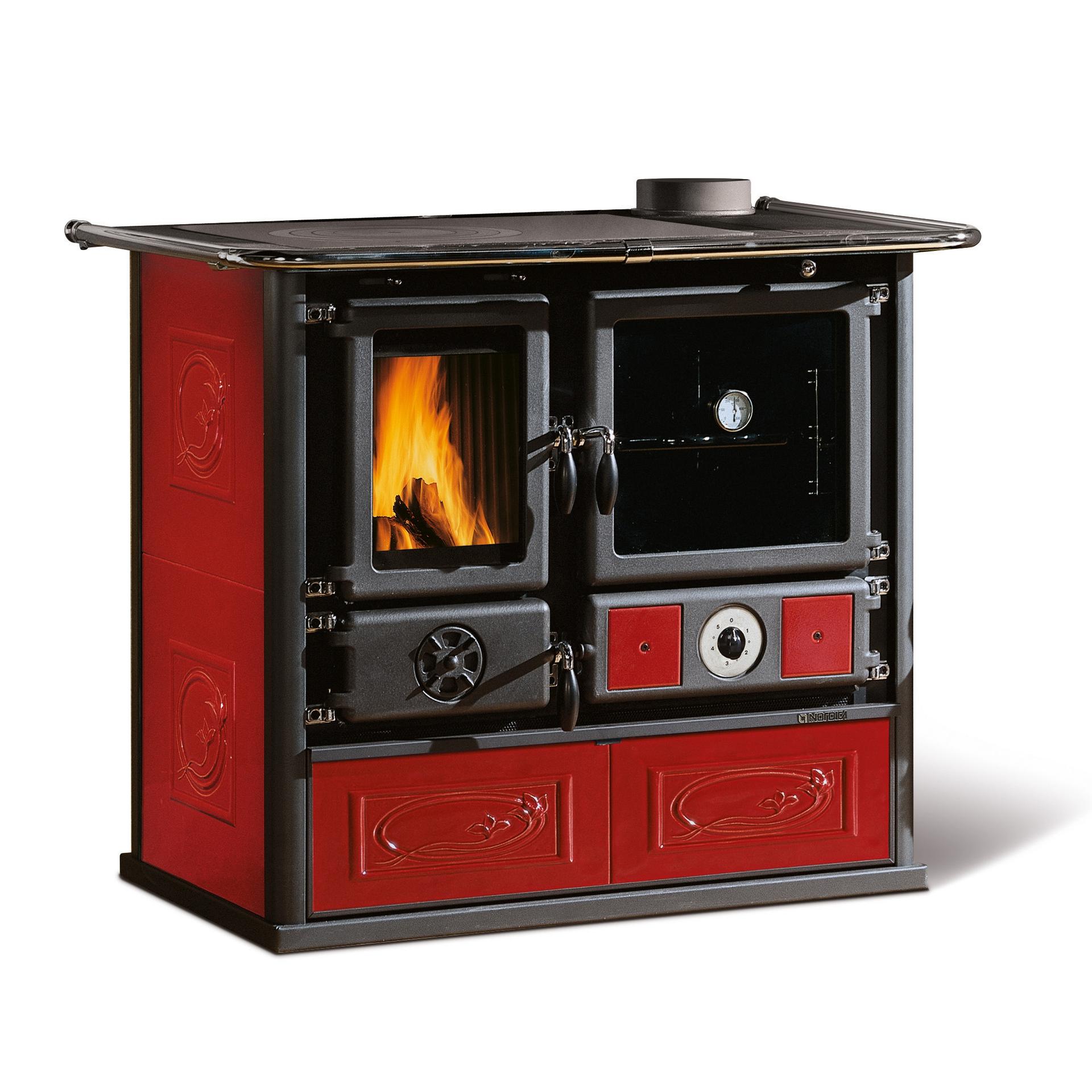 Etažni štedilnik na drva z varnostno napravo DSA (ventil DSA ni vključen). Dvojna steklena vrata kurišča in pročelje iz poliranega litega železa.