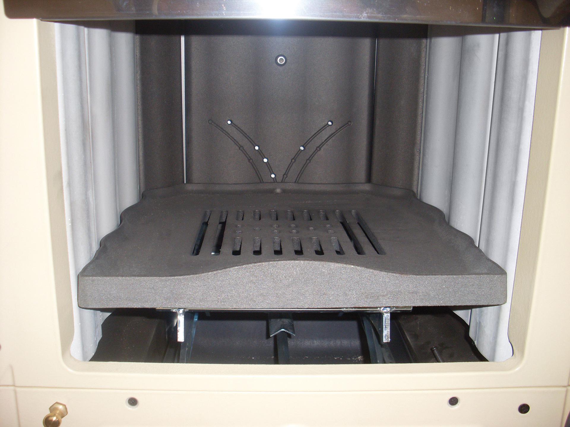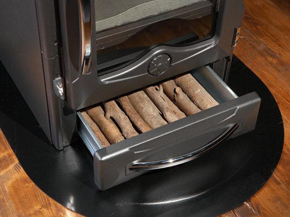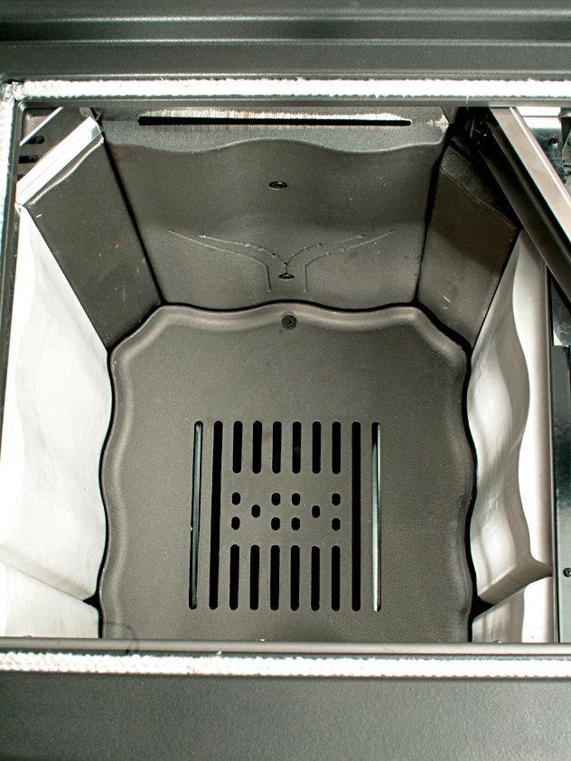 Učinkovito izgorevanje z nastavljivim primarnim in sekundarnim zrakom s sistemom za naknadno zgorevanje za nizke emisije. Nastavljiva litoželezna rešetka in vrata kurišča z dvojnim steklom s širokim pogledom na ogenj. Izvlečni predal za drva.