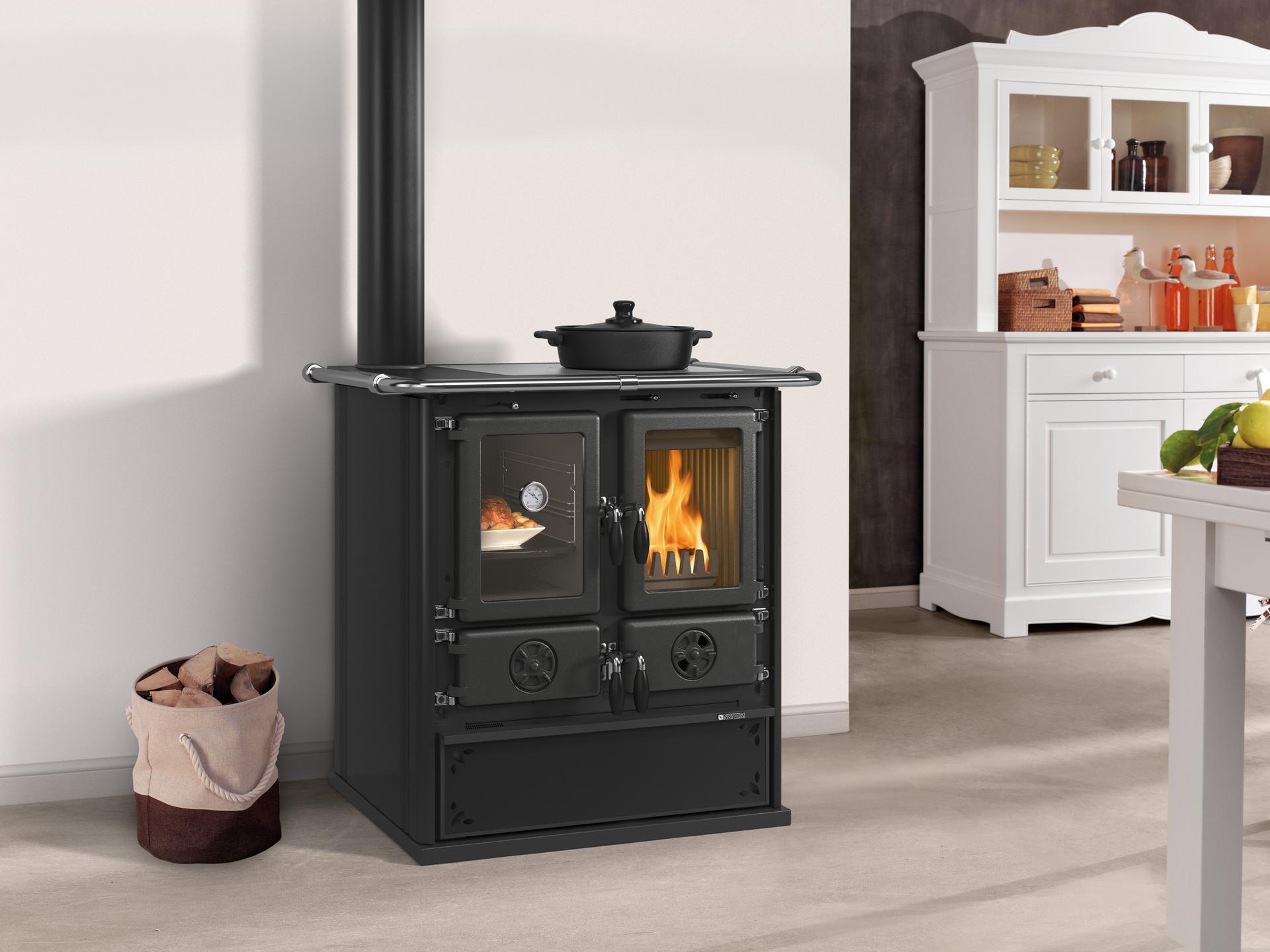 Štedilnik na drva z emajlirano jekleno oblogo in odvodom dima na zgornji levi ali zadnji levi strani. Kuhalna plošča in obroči iz poliranega litega železa. Notranja obloga kurišča iz litega železa in ognjevzdržnega materiala. Izvlečni predal za drva. Vrata kurišča iz litega železa. Keramično steklo.