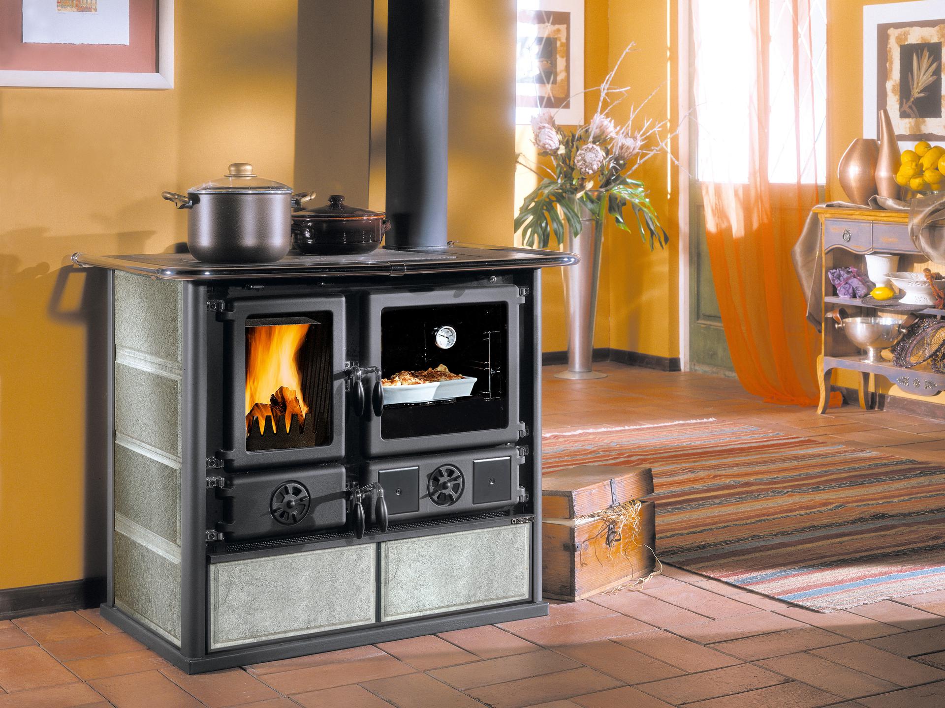 Štedilnik na drva s prevleko iz naravnega kamna. Kuhalna plošča in obroči iz polirane litine. Vrata in okvir iz emajlirane litine. Notranja obloga kurišča iz litega železa. Nastavljiv primarni in sekundarni zrak za boljši nadzor zgorevanja in nizke emisije.