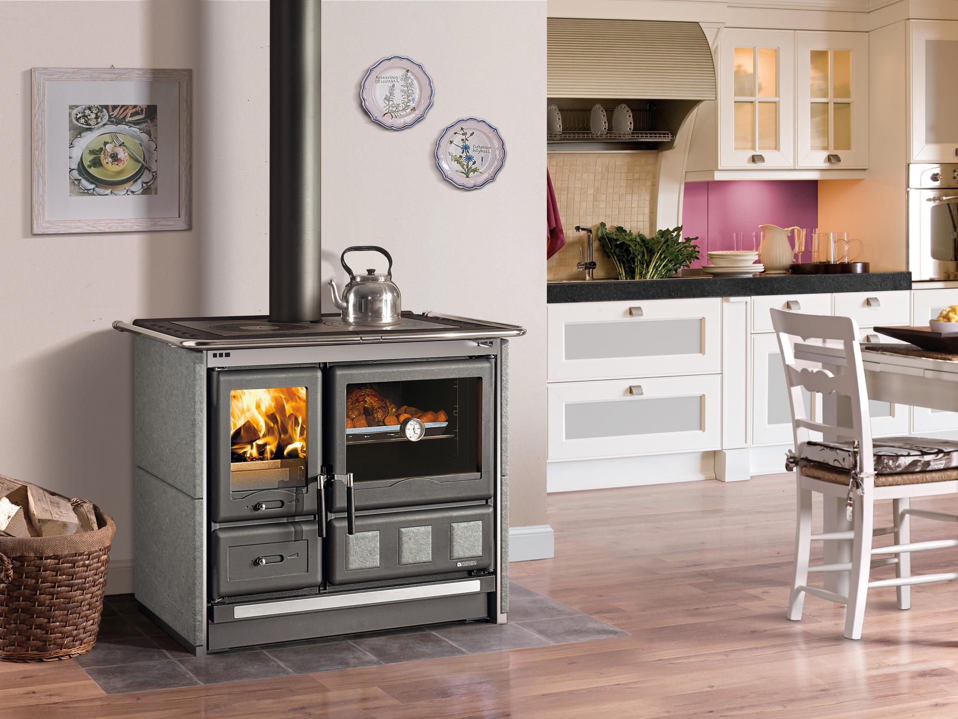 Tradicionalni štedilnik na drva z zunanjo oblogo iz naravnega kamna. Kuhalna plošča in obroči iz poliranega litega železa. Notranja obloga kurišča iz litega železa in ognjevzdržnega materiala. Izvlečni predal za drva. Vrata kurišča iz litega železa z dvojnim steklom.