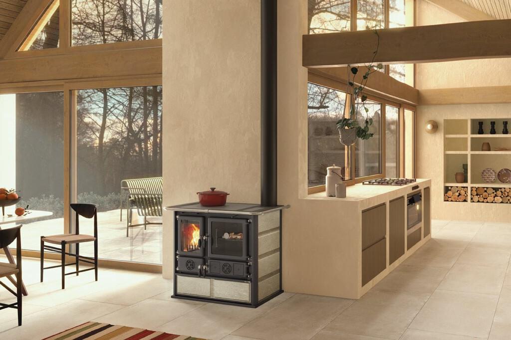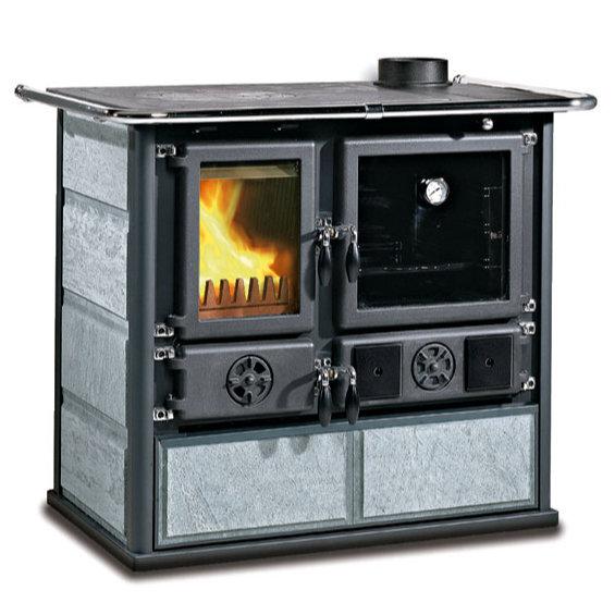 Tradicionalno oblikovan štedilnik na drva z oblogo iz naravnega kamna. Zgornja plošča in obroči so iz poliranega litega železa. Vrata in okvir sta iz emajliranega litega železa. Prostorna pečica je iz emajliranega jekla.