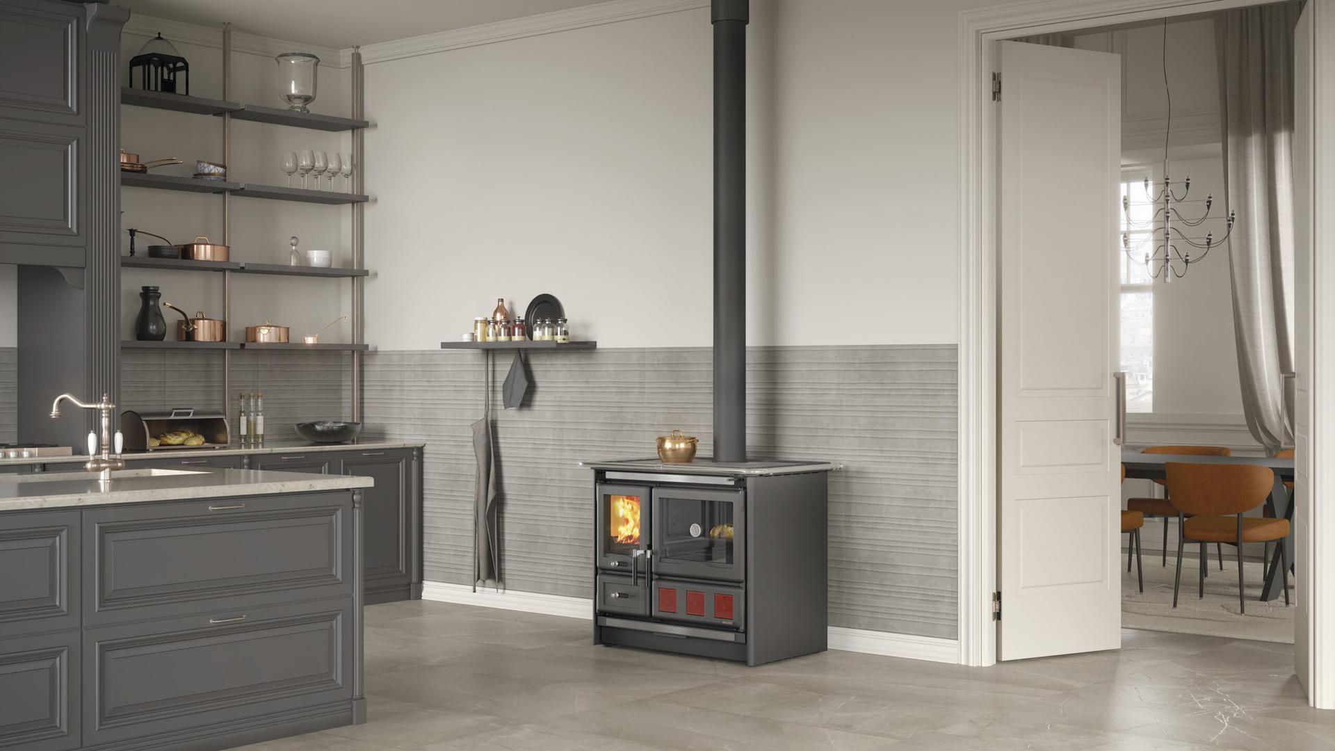 Rosa XXL z 78-litrsko emajlirano pečico in jekleno oblogo, prevlečeno s porcelanom, združuje funkcionalnost z vzdržljivo strukturo. Na voljo v bordo in neskončno beli barvi, zato je kot nalašč primerna za opremljanje kuhinje, dvojno steklo in predal za drva pa povečata njeno vrednost in praktičnost.