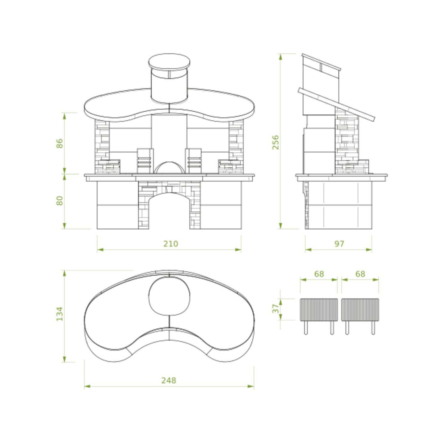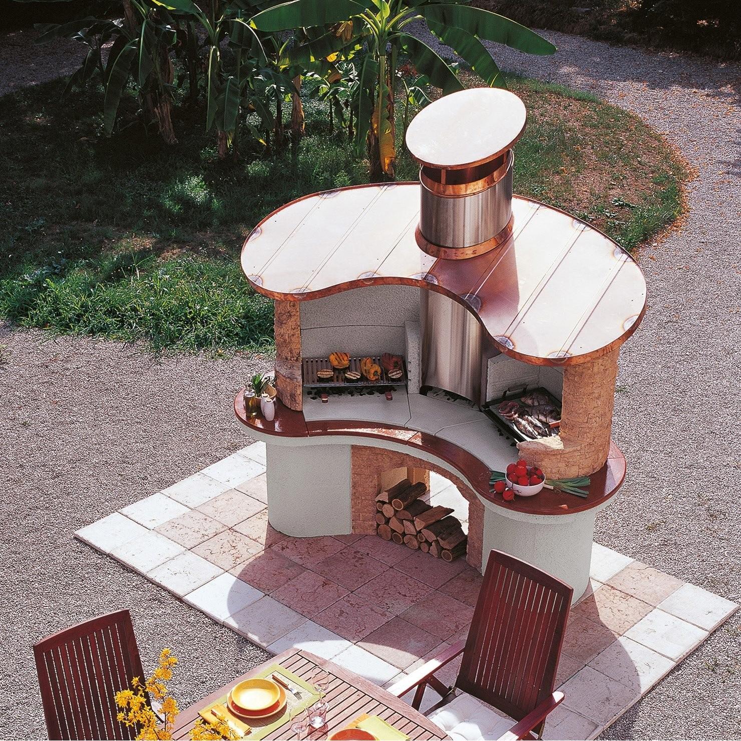 Če nimate težav s prostorom in želite nekaj resnično edinstvenega in ekskluzivnega, je to vrtni kamini za vas. Elegantno izdelan iz tehničnega kamna z bakreno streho ima dvojno kuhalno postajo, tako da lahko hkrati preizkušate različne tehnike priprave hrane. Posebnost je osrednja zgorevalna komora iz nerjavnega jekla z zadnjim polnjenjem drv, ki omogoča neprekinjeno izdelavo oglja za uporabo na obeh postajah.