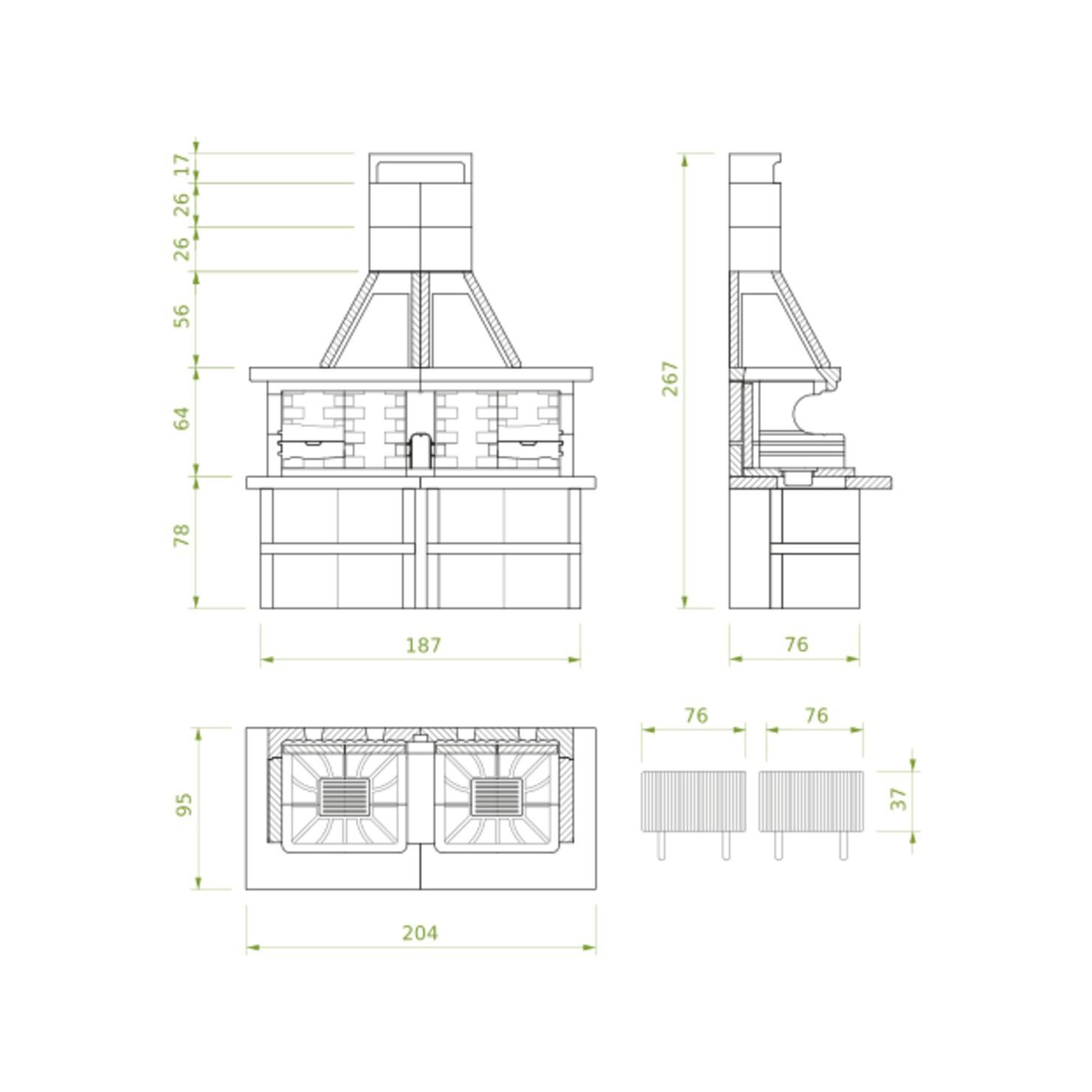 Palazzetti Miami 3 je izdelan tako, da z dvema rešetkama za žar iz nerjavečega jekla nahrani množico ljudi. Vsaka rešetka je nameščena druga ob drugi in je nastavljiva po višini, kar vam omogoča natančen nadzor nad temperaturami pečenja. Kovinska podnapa pod dimnikom ščiti konstrukcijo pred izjemno vročino in vročimi dimnimi plini. Ojačano kurišče ima dvostensko zasnovo z votlimi komorami, v katerih kroži hladilni zrak, kar preprečuje pregrevanje in zagotavlja dolgotrajno vzdržljivost.