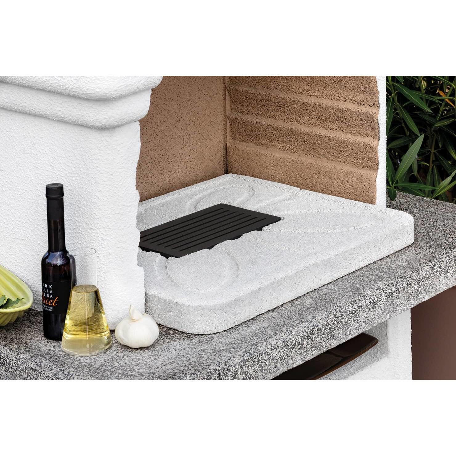 Vrtni kamin Palazzetti Salina 2 odlikuje vremensko odporna konstrukcija z ojačanim ognjevarnim glinenim kuriščem in diskretnim kovinskim podkapom, ki ščiti pred močno vročino. Ta kovinska obloga, ki je skrita pod glavnim pokrovom, ščiti konstrukcijo pred temperaturami izgorevanja, hkrati pa je od zunaj nevidna. Modularna zasnova omogoča enostavno sestavljanje, nedokončane površine pa vam omogočajo, da videz žara prilagodite svoji zunanji estetiki. Paket dopolnjuje granitna delovna površina Marmotech, izdelana iz toplotno odpornega marmornatega agregata, ki zagotavlja poliran in trpežen delovni prostor.