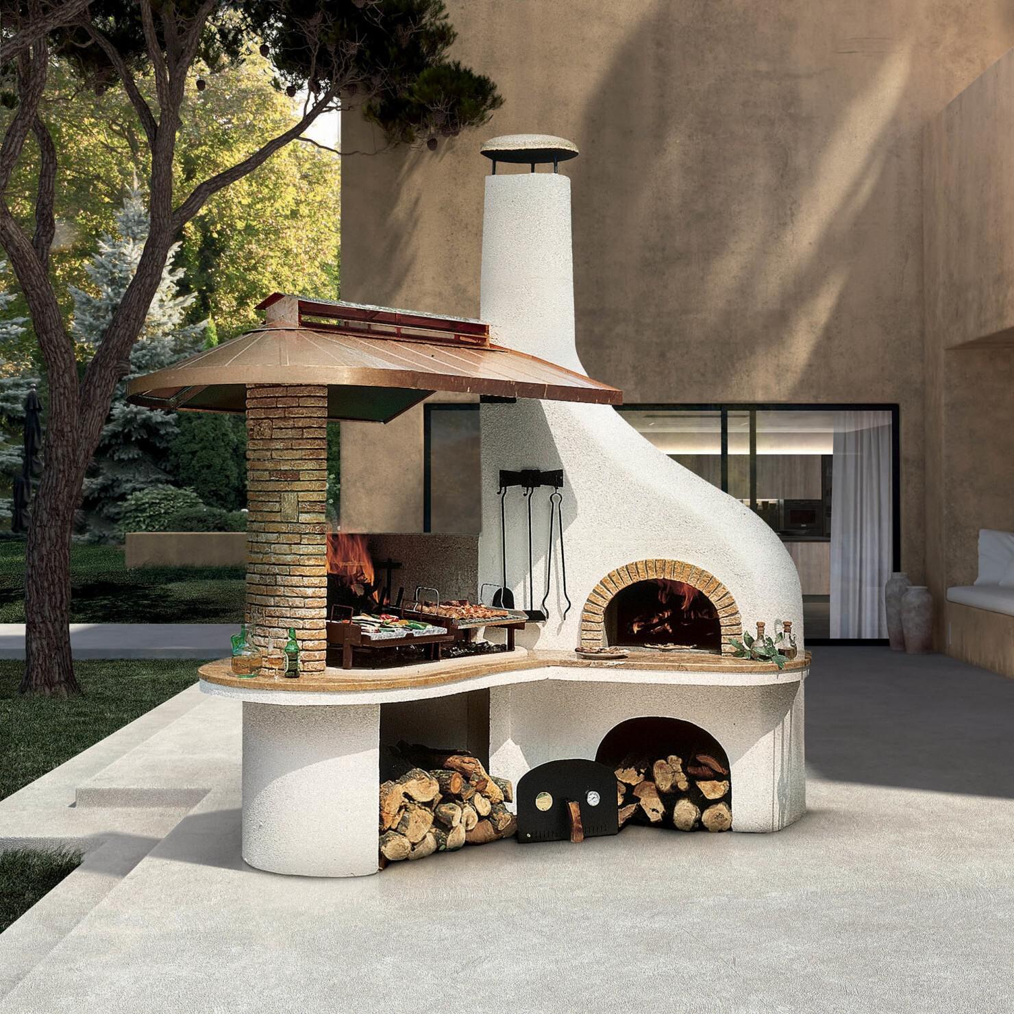 Model Vulcano Lux priznanega proizvajalca Palazzetti ponuja celovito rešitev za kuhanje na prostem za vrtove in terase. Ta impresivna postavitev združuje prostoren žar z vgrajeno pečjo iz ognjevzdržne gline. Peč ima vrata iz lakiranega jekla z okencem in vgrajenim termometrom za natančno spremljanje temperature. Z notranjim premerom 88 cm je dovolj velika za peko več pic hkrati. Elegantno estetiko dopolnjujejo pulti iz poliranega marmorja Giallo Reale.