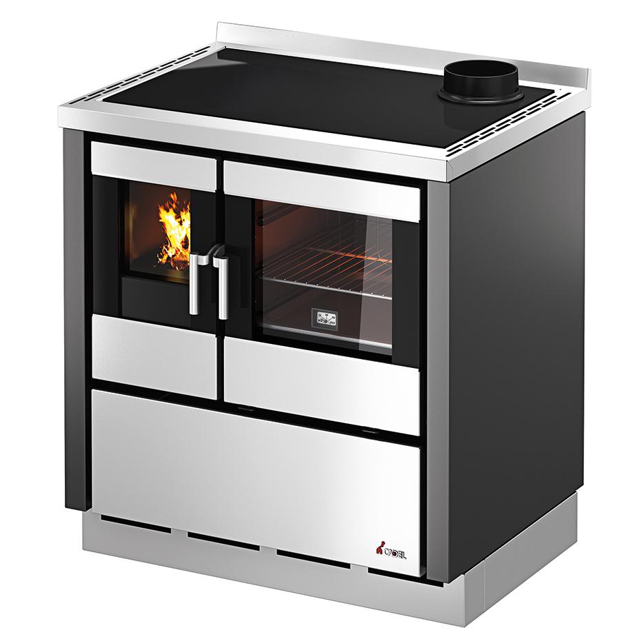 Ta vgradni štedilnik na drva odlikujejo prostor, namenjen pečici, široko steklo, skozi katerega lahko vidite, kako poteka peka, in široko kurišče, da imate vse pod nadzorom. Velika pečica iz nerjavnega jekla zagotavlja enakomerno peko hrane, aparat pa je enostaven za čiščenje, medtem ko je kuhalna plošča, ki je serijsko izdelana iz litega železa, na voljo tudi v steklokeramični različici.