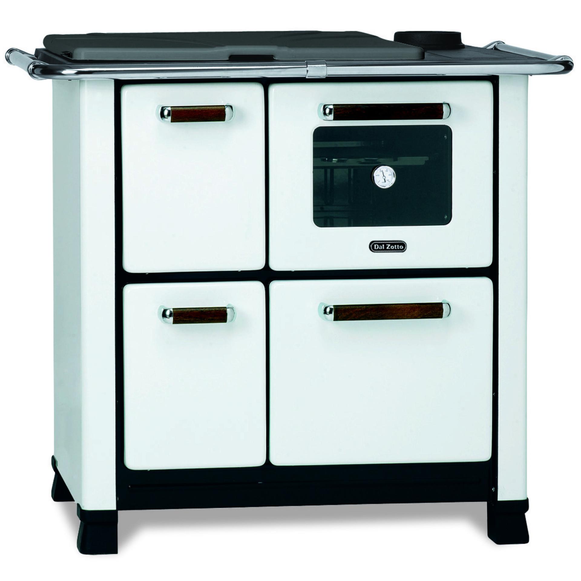 Štedilnik na drva s porcelanasto jekleno oblogo. Termometer z žarnico, emajlirana pečica in pladenj. Okvir iz vitrificirane litine. Gladka kuhalna plošča iz litega železa.