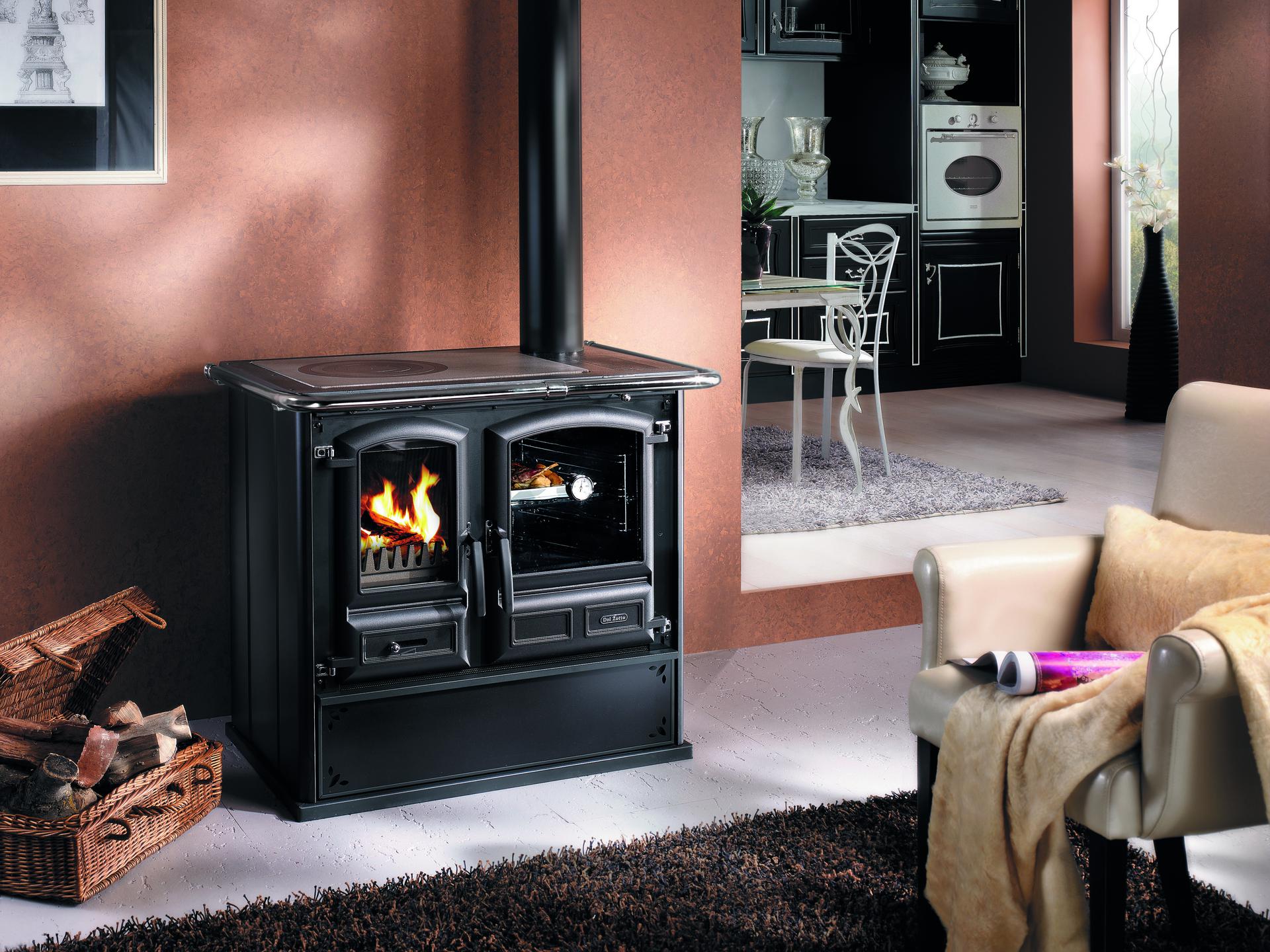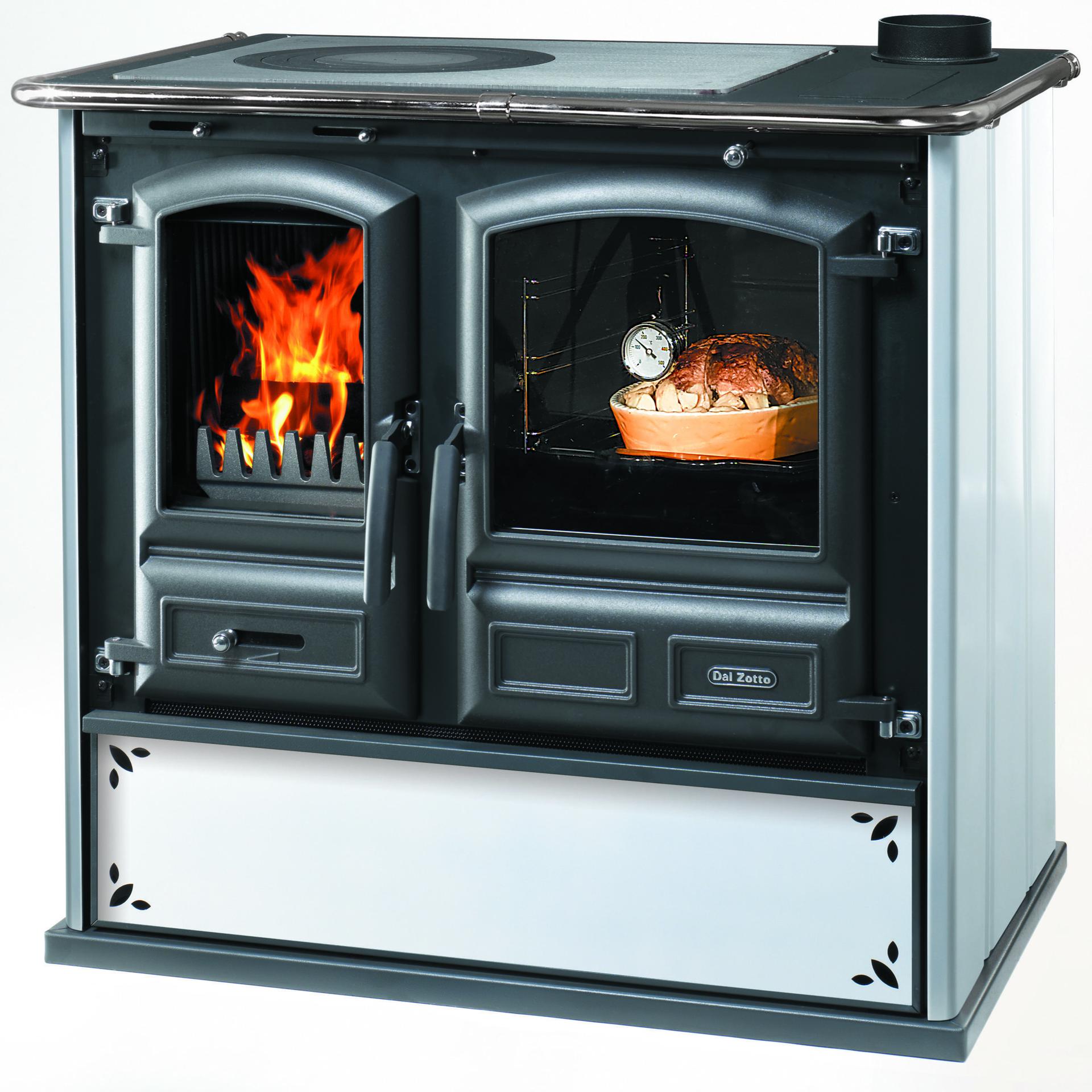 Štedilnik na drva z jekleno oblogo, pečico s panoramskim pogledom in velikim predalom za drva. Veliko ognjišče iz litega železa s panoramskimi vrati iz litega železa in keramičnim steklom. Litoželezna plošča dvojne debeline.