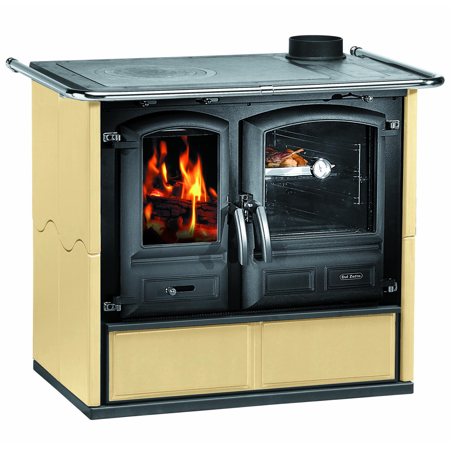 Štedilnik na drva z zunanjo oblogo iz majolike, pečico s panoramskim steklom in velikim predalom za drva. Veliko ognjišče in vrata kurišča iz litega železa s panoramskim keramičnim steklom. Litoželezna plošča dvojne debeline. Primarni in sekundarni zrak ter dvojno izgorevanje.