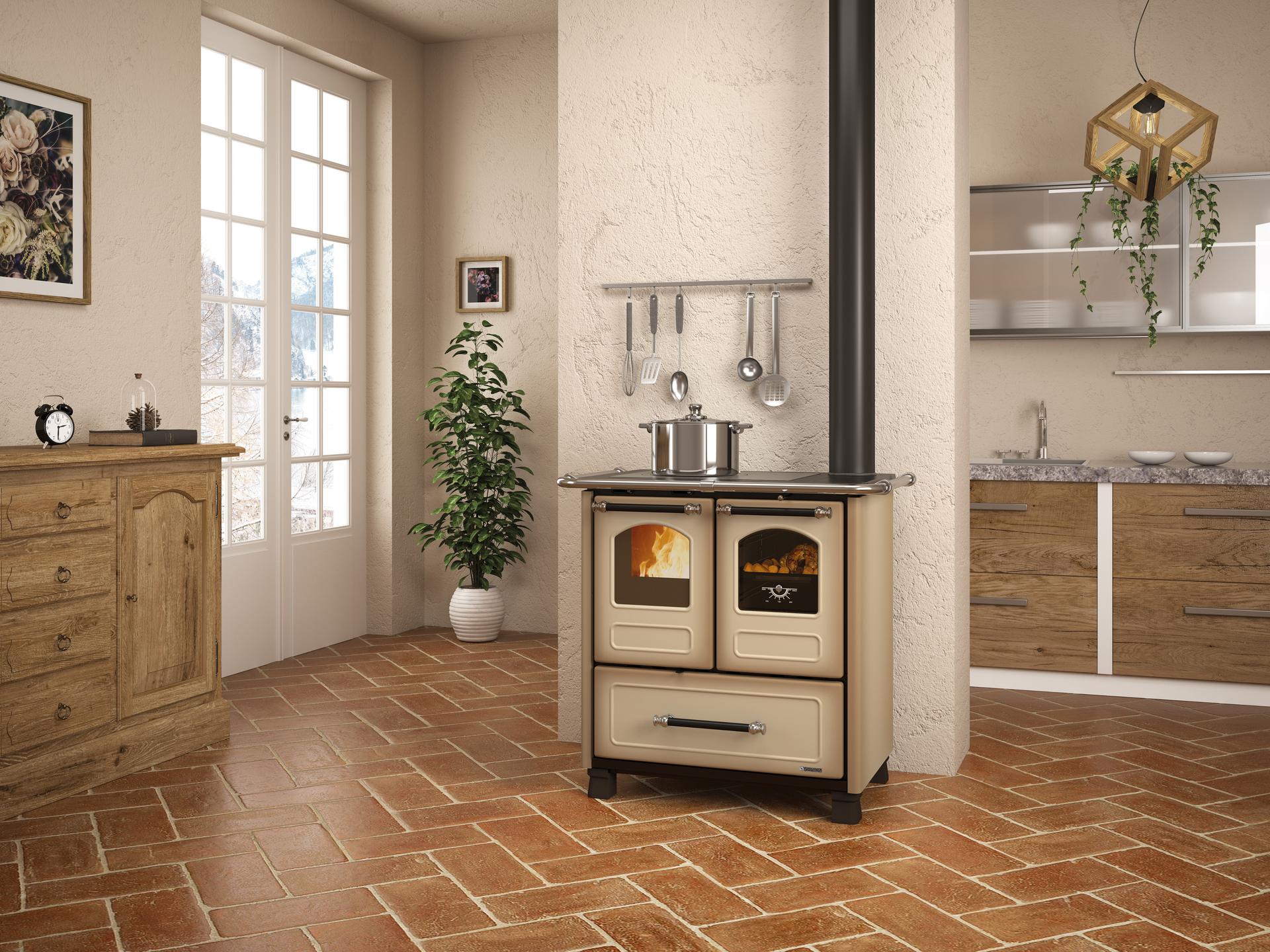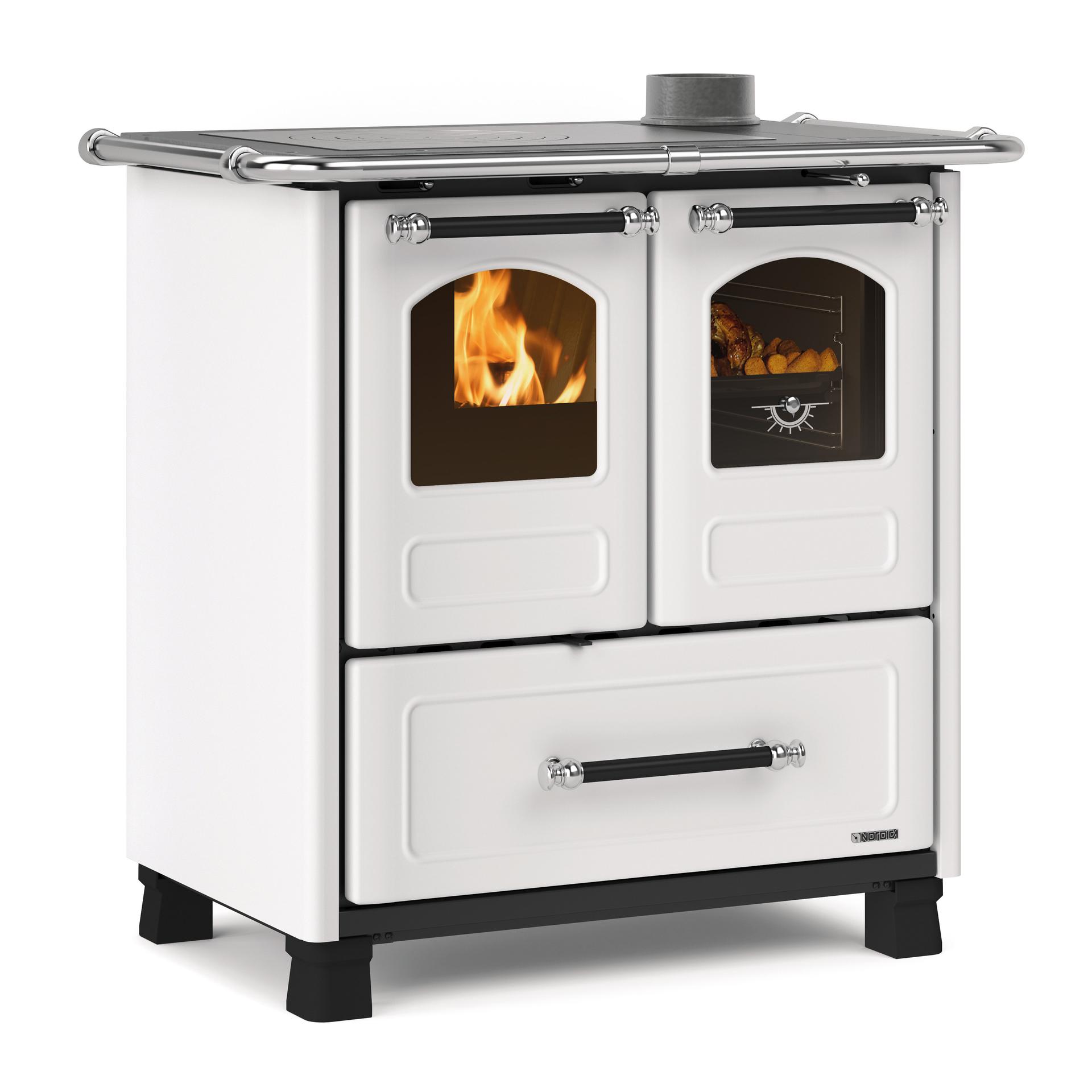 Tradicionalni štedilnik na drva z nogicami za lažje čiščenje. Emajlirana litoželezna obloga in okvir. Notranja obloga kurišča iz litega železa z izvlečnim predalom za pepel. Vrata kurišča iz litega železa z dvojnim steklom, pri čemer je notranje steklo iz keramike.