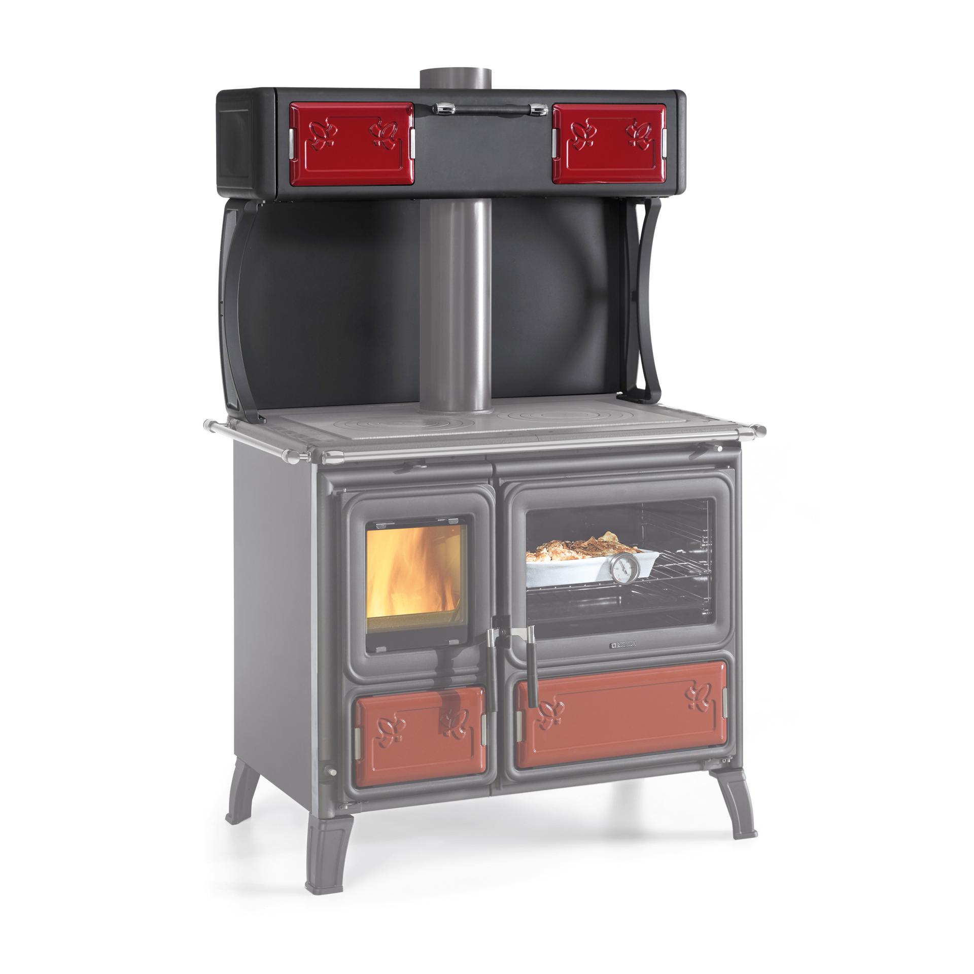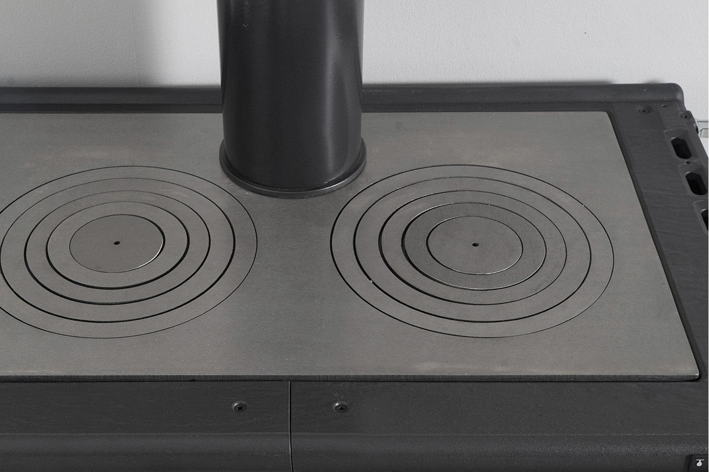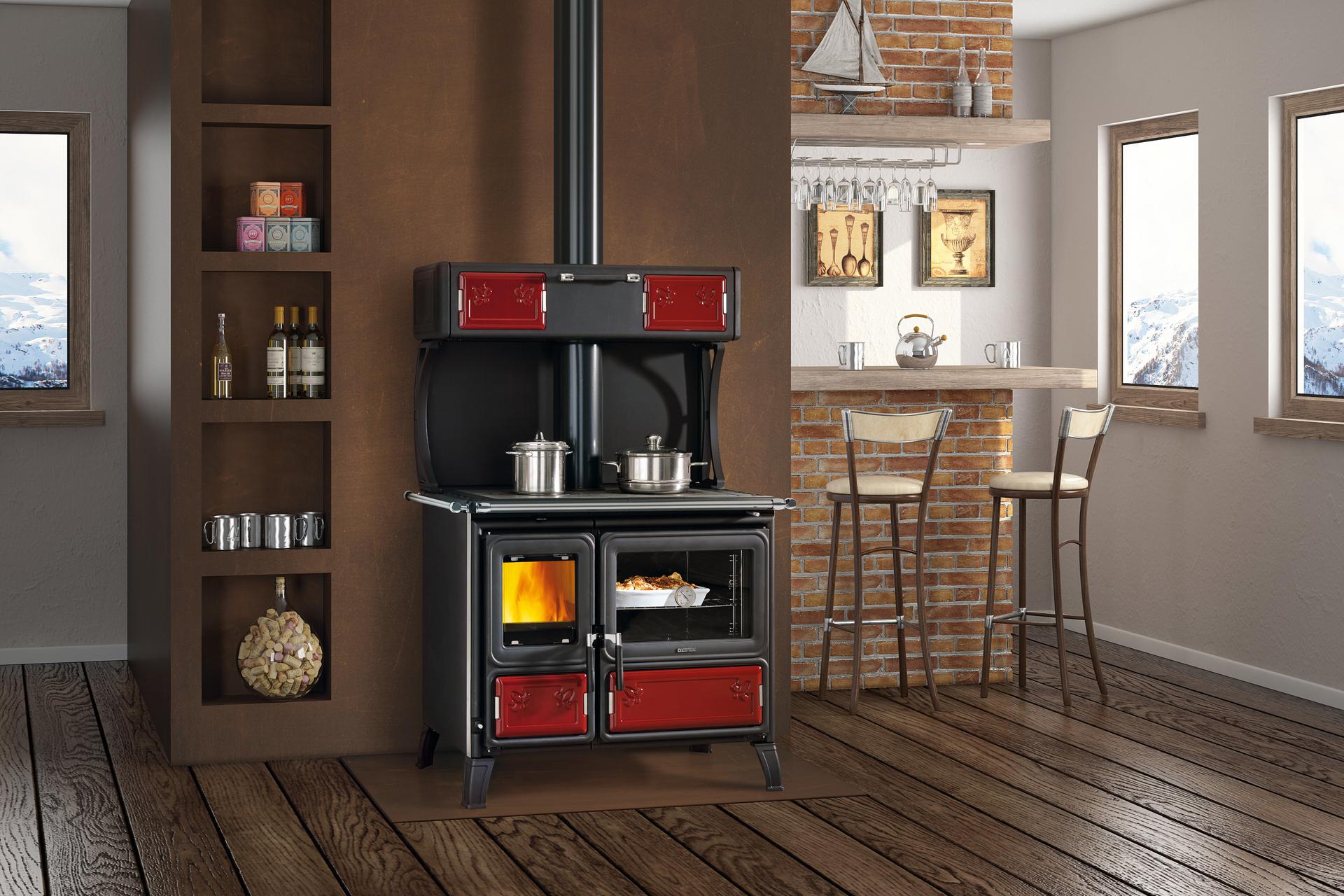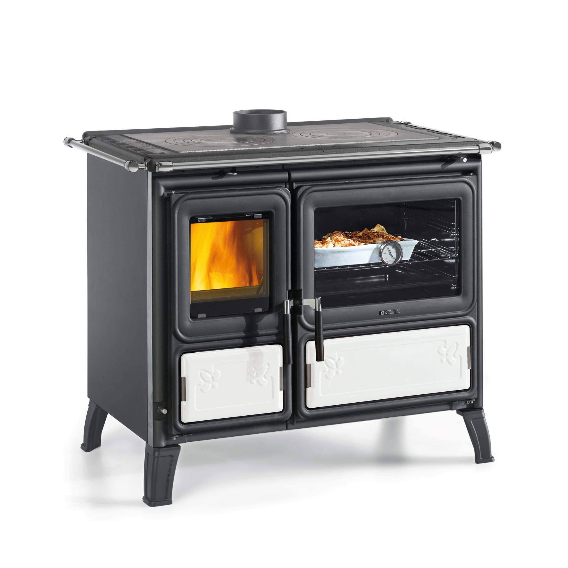 Štedilnik na drva La Nordica Milly je zaradi svoje edinstvene zasnove dobro prepoznaven. Opremljen je z nogicami za lažje čiščenje. Robustnost je opazna pri emajliranih litoželeznih vratih, prednjem delu in okvirju. Vrata za kurjavo so opremljena z dvojnim steklom, pri čemer je notranje steklo keramično. Odličen štedilnik za kuhanje na zgornji kuhalni plošči iz poliranega litega železa z dvojnim obročem in pečenje v veliki pečici iz emajliranega jekla.