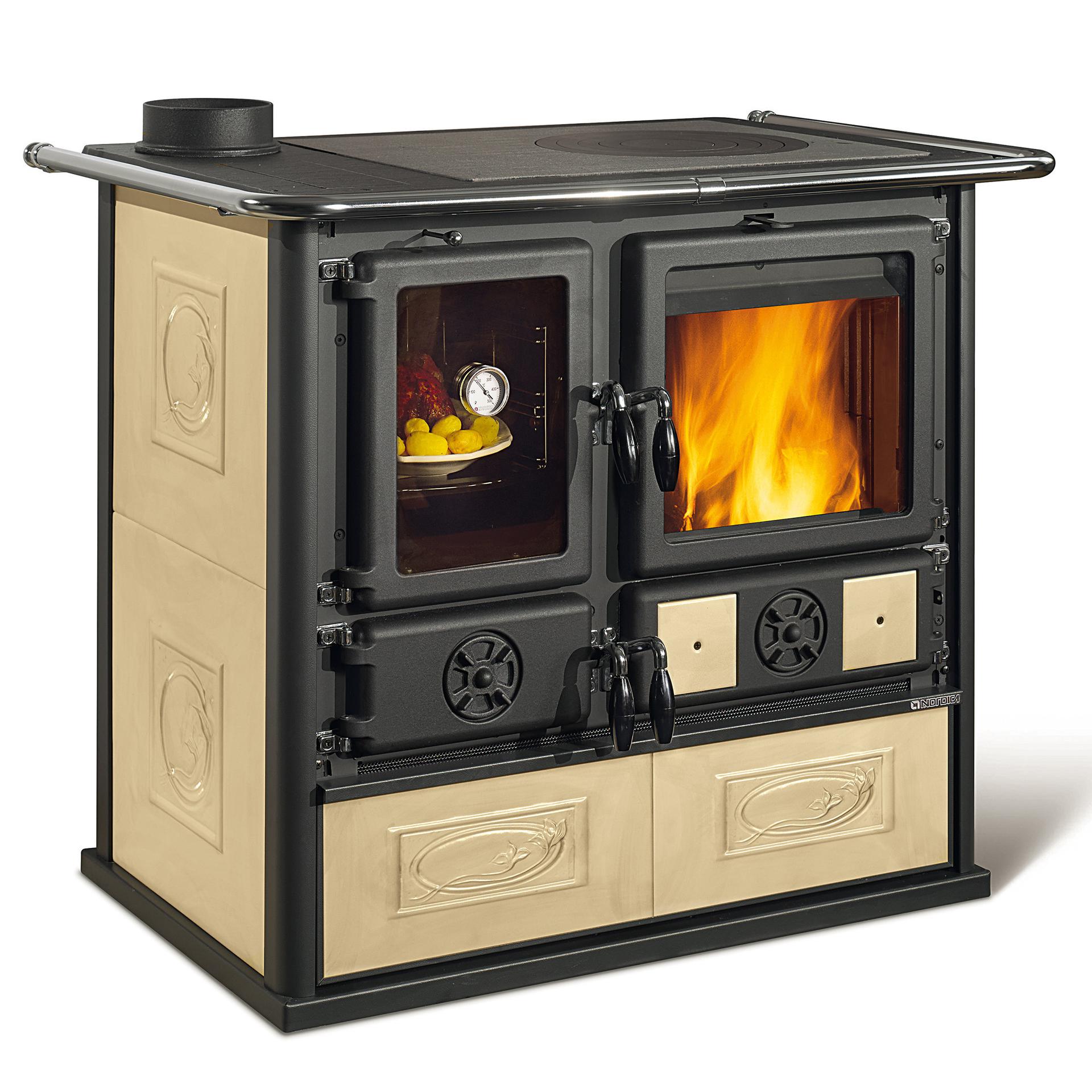 Štedilnik na drva s širokim pogledom na ogenj in z dimnim izhodom levo zgoraj ali levo zadaj. Kuhalna plošča in obroči iz polirane litine. Notranja obloga kurišča iz litega železa in ognjevzdržnega materiala. Izvlečni predal za drva. Vrata za ogenj iz litega železa z dvojnim steklom. Serijsko priložen komplet 2 črnih ploščic 10x10 cm.