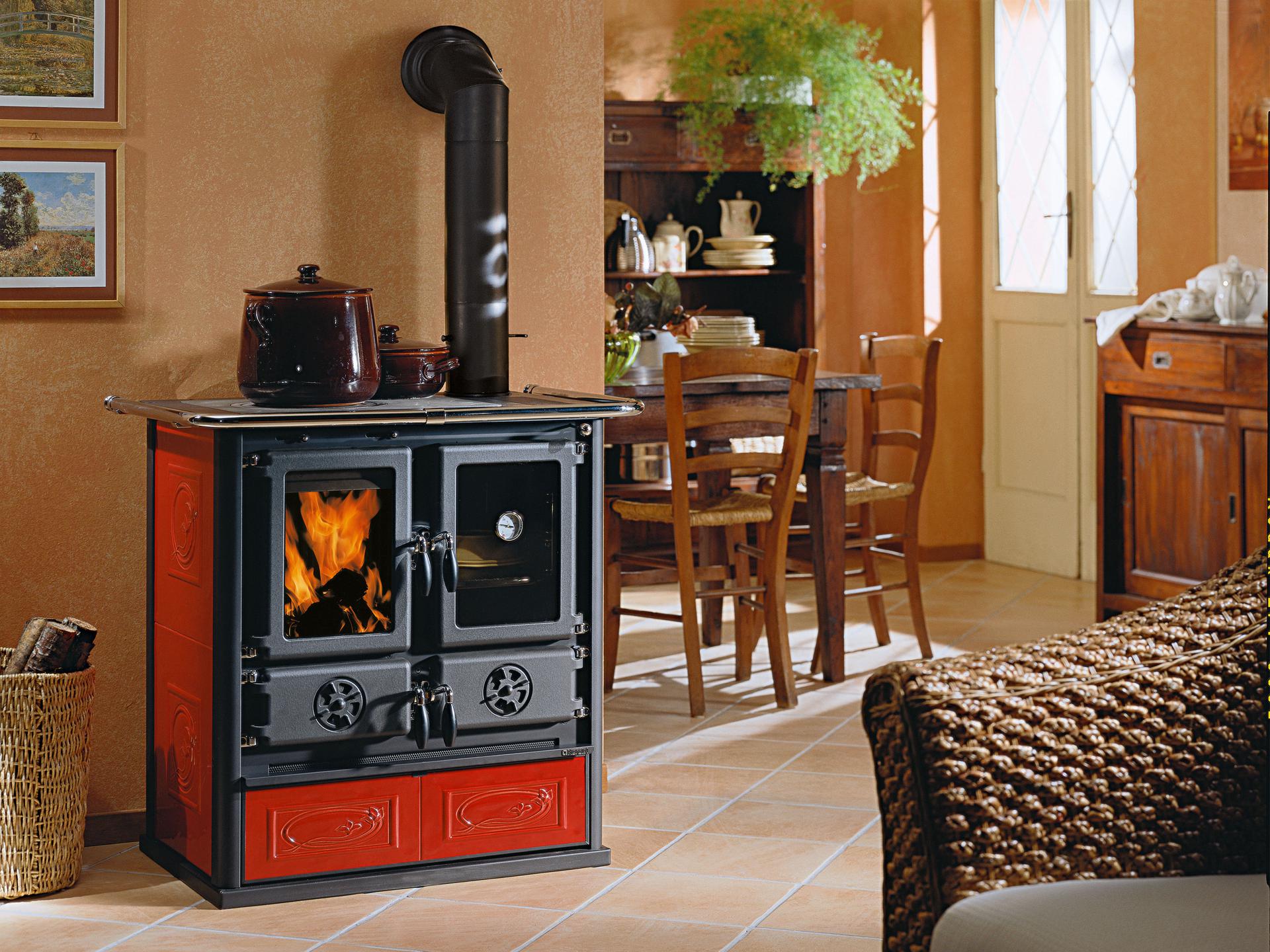 Štedilnik na drva z zunanjo oblogo iz majolike ali naravnega kamna. Kuhalna plošča in obroči iz poliranega litega železa. Notranja obloga kurišča iz litega železa in ognjevzdržnega materiala. Izvlečni predal za drva. Vrata kurišča iz litega železa. Keramično steklo.