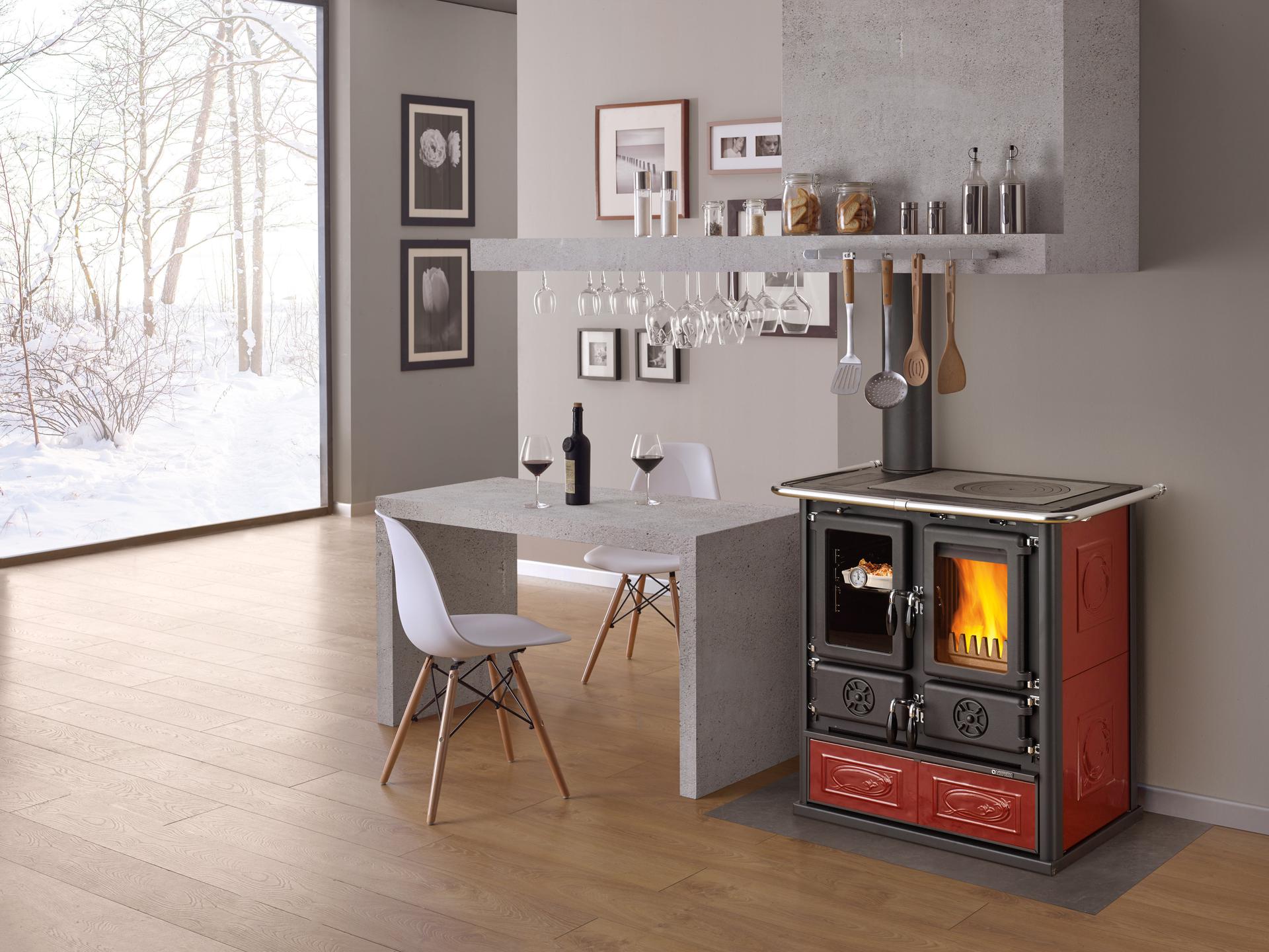 Kuhalnik na drva z zunanjo oblogo iz majolike ali naravnega kamna in dimnim izpustom levo zgoraj ali levo zadaj. Kuhalna plošča in obroči iz polirane litine. Notranja obloga kurišča iz litega železa in ognjevzdržnega materiala. Izvlečni predal za drva. Vrata kurišča iz litega železa. Keramično steklo.