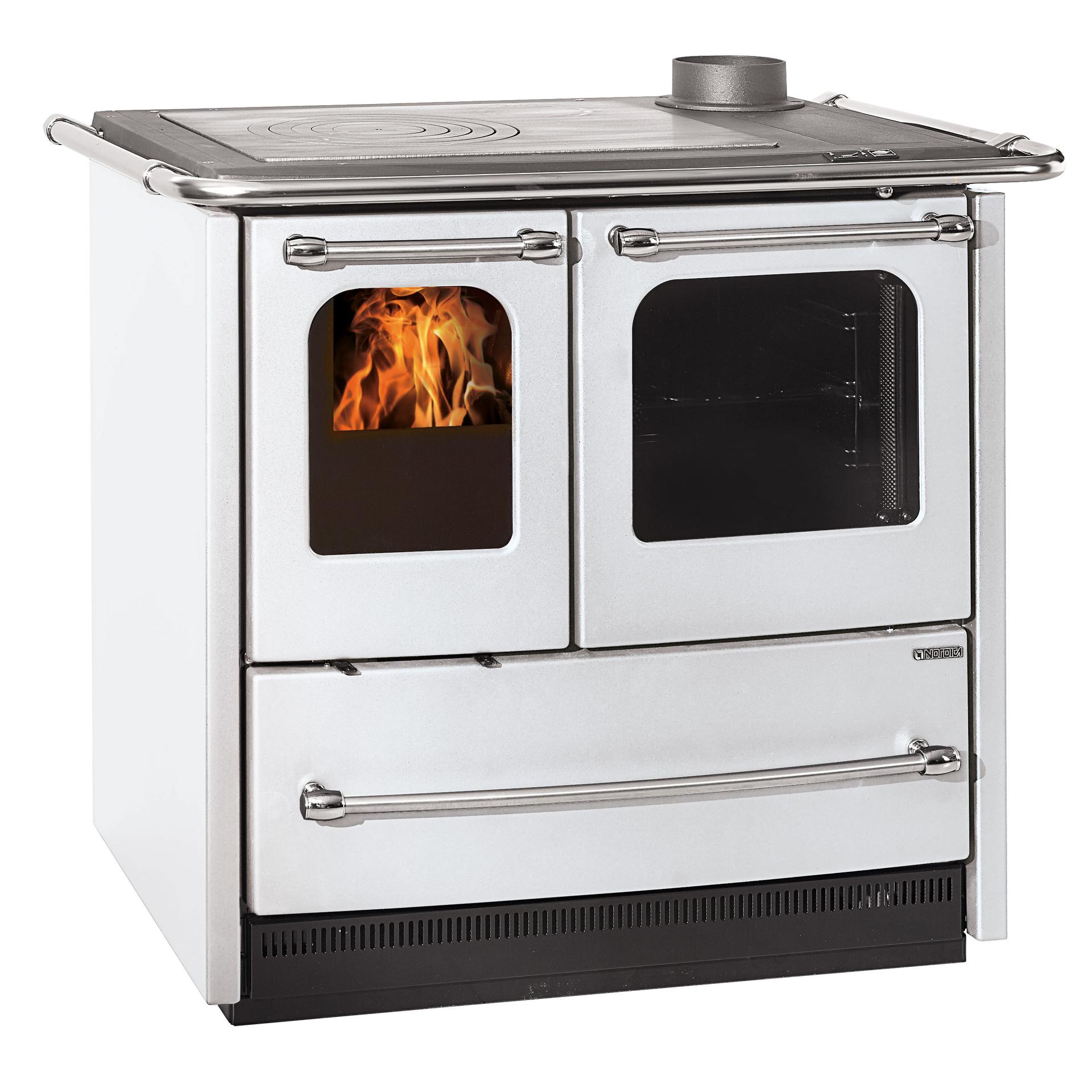 Tradicionalni štedilnik na drva z nogicami za lažje čiščenje. Emajlirana litoželezna obloga in okvir. Notranja obloga kurišča iz litega železa z izvlečnim predalom za pepel. Vrata kurišča iz litega železa z dvojnim steklom, pri čemer je notranje steklo iz keramike.